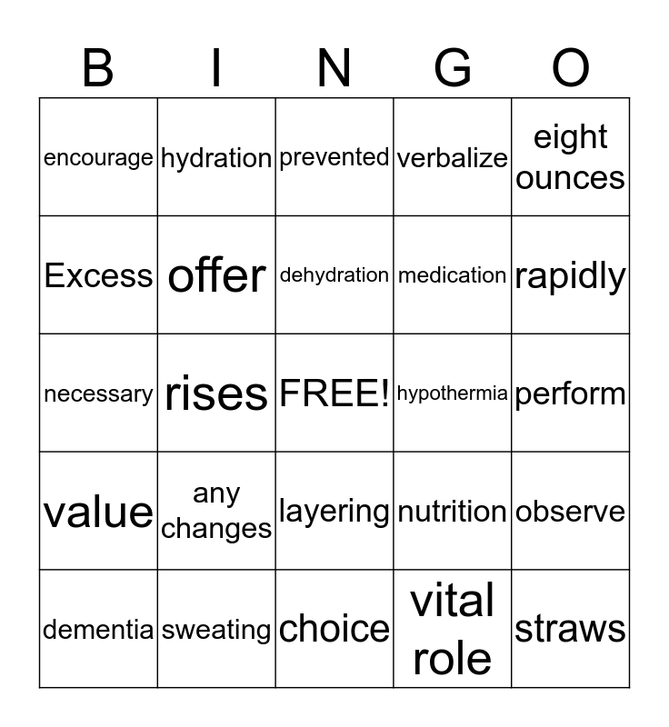 This bingo card has a free space and 25 words: any changes, choice, dehydration, dementia, eight ounces, encourage, Excess, hydration, hypothermia, layering, medication, necessary, nutrition, observe, offer, overexposure, perform, prevented, rapidly, rises, straws, sweating, value, verbalize and vital role.