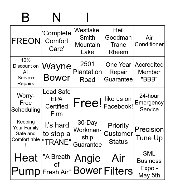 This bingo card has a free space and 24 words: It's hard to stop a "TRANE", "A Breath of Fresh Air", 2501 Plantation Road, Heat Pump, Air Conditioner, FREON, 10% Discount on All Service Repairs, 'Complete Comfort Care', like us on Facebook!, 30-Day Workman- ship Guarantee, One Year Repair Guarantee, Worry-Free Scheduling, Priority Customer Status, Precision Tune Up, Wayne Bower, Air Filters, 24-hour Emergency Service, Westlake, Smith Mountain Lake, Accredited Member "BBB", Lead Safe EPA Certified Firm, SML Business Expo - May 5th, Keeping Your Family Safe and Comfort-able !, Heil Goodman Trane Rheem and Angie Bower.