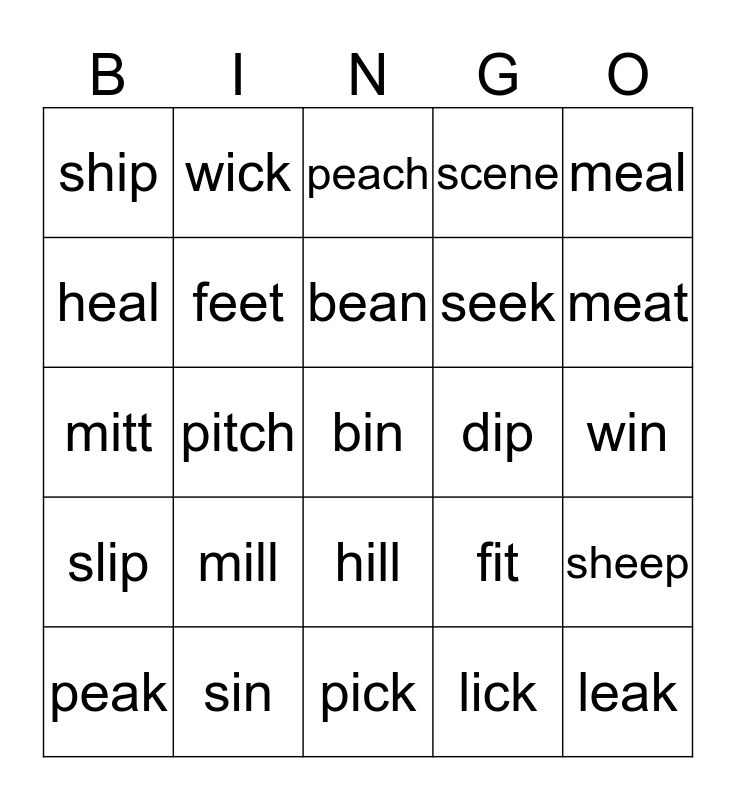 This bingo card has 32 words: lick, wean, pitch, deep, slip, feet, meal, sheep, wick, leak, bean, peach, chick, sick, dip, cheek, peak, mitt, hill, mill, fit, sleep, win, sin, bin, scene, seek, heal, ship, pick, week and meat.