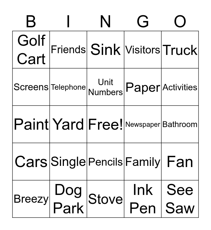 This bingo card has a free space and 24 words: Single, Dog Park, Unit Numbers, Breezy, Truck, Golf Cart, Screens, Friends, Newspaper, Pencils, Paper, Paint, Family, Fan, Telephone, Ink Pen, Bathroom, Sink, Activities, Yard, See Saw, Cars, Visitors and Stove.
