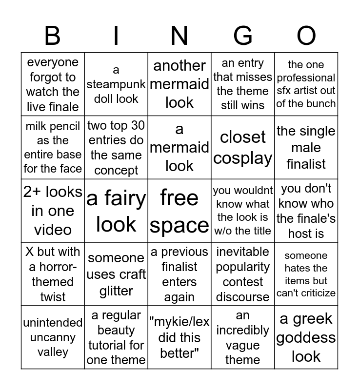 This bingo card has a free space and 24 words: someone uses craft glitter, a regular beauty tutorial for one theme, a mermaid look, unintended uncanny valley, the one professional sfx artist out of the bunch, everyone forgot to watch the live finale, milk pencil as the entire base for the face, a steampunk doll look, you wouldnt know what the look is w/o the title, a previous finalist enters again, closet cosplay, 2+ looks in one video, inevitable popularity contest discourse, someone hates the items but can't criticize, two top 30 entries do the same concept, an incredibly vague theme, you don't know who the finale's host is, another mermaid look, the single male finalist, a fairy look, a greek goddess look, X but with a horror-themed twist, an entry that misses the theme still wins and "mykie/lex did this better".