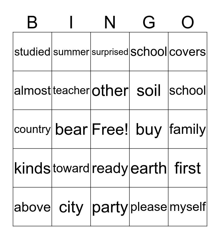 This bingo card has a free space and 29 words: above, even, bear, pushed, studied, surprised, teacher, toward, buy, city, family, myself, party, please, school, seven, ready, kinds, covers, country, earth, warms, soil, almost, school, summer, first, other and water.