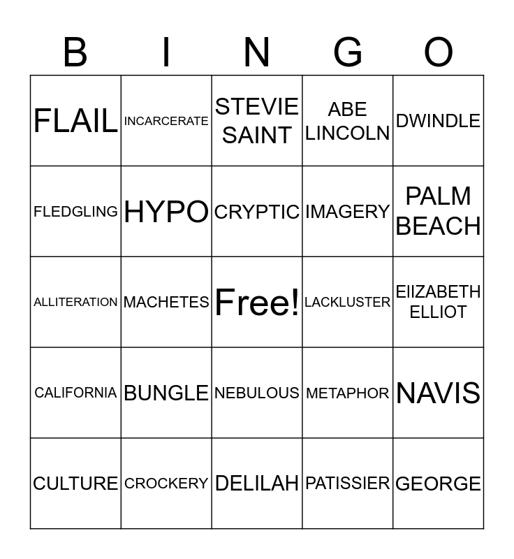 This bingo card has a free space and 24 words: BUNGLE, CROCKERY, CRYPTIC, CULTURE, DWINDLE, FLAIL, FLEDGLING, INCARCERATE, LACKLUSTER, NEBULOUS, IMAGERY, ALLITERATION, METAPHOR, NAVIS, HYPO, PATISSIER, ElIZABETH ELLIOT, STEVIE SAINT, PALM BEACH, MACHETES, GEORGE, CALIFORNIA, ABE LINCOLN and DELILAH.