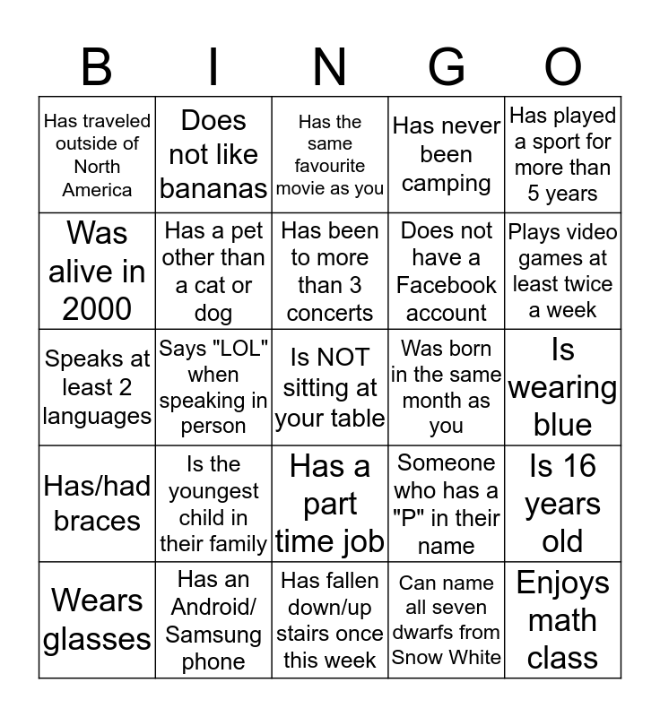 This bingo card has a free space and 24 words: Is the youngest child in their family, Has an Android/ Samsung phone, Has been to more than 3 concerts, Wears glasses, Has played a sport for more than 5 years, Has traveled outside of North America, Was alive in 2000, Does not like bananas, Was born in the same month as you, Has a part time job, Does not have a Facebook account, Speaks at least 2 languages, Someone who has a "P" in their name, Is 16 years old, Has a pet other than a cat or dog, Can name all seven dwarfs from Snow White, Is wearing blue, Has the same favourite movie as you, Plays video games at least twice a week, Says "LOL" when speaking in person, Enjoys math class, Has/had braces, Has never been camping and Has fallen down/up stairs once this week.