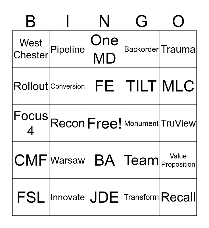 This bingo card has a free space and 39 words: Asset Managment, Audit, GUI, Conversion, FSL, BA, FE, Perspective, Trauma, CMF, Recon, Backorder, Recall, TruView, Monument, Warsaw, Raynham, West Chester, Eval, Team, Rollout, JDE, TILT, MLC, BME, DHR, DFE, NPI, Com Ops, Pipeline, Analytics, Solution, One MD, Innovate, Transform, Potential, Value Proposition, Focus 4 and Deliverables.