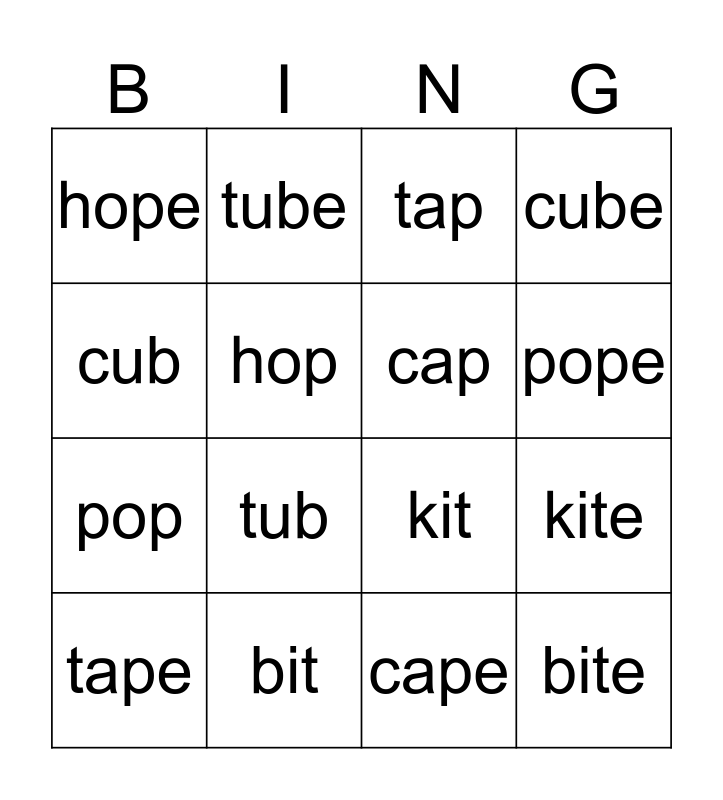 This bingo card has 16 words: bit, kite, tap, hope, pop, tube, kit, cape, cub, hop, tape, cube, tub, pope, cap and bite.