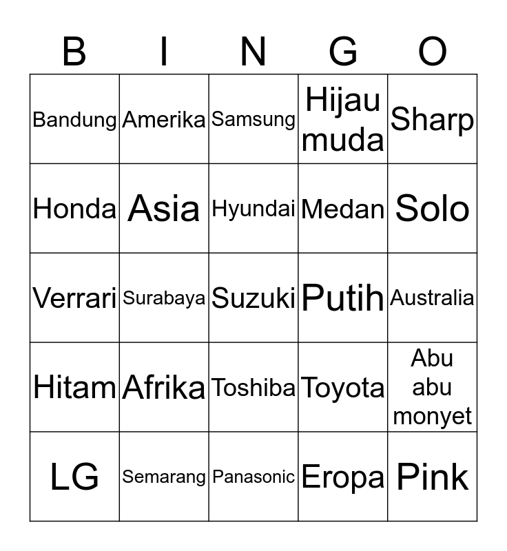 This bingo card has a free space and 24 words: Afrika, Semarang, Hyundai, LG, Sharp, Bandung, Honda, Amerika, Putih, Toshiba, Medan, Verrari, Toyota, Abu abu monyet, Asia, Eropa, Australia, Samsung, Solo, Surabaya, Pink, Hitam, Hijau muda and Panasonic.