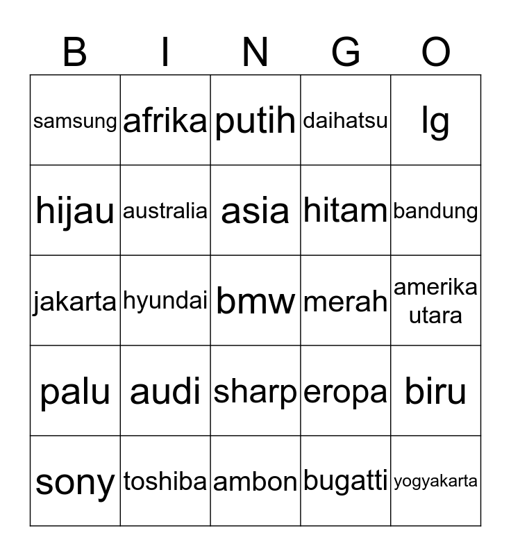 This bingo card has a free space and 24 words: audi, toshiba, asia, sony, lg, samsung, hijau, afrika, merah, sharp, hitam, jakarta, eropa, biru, australia, bugatti, amerika utara, putih, bandung, hyundai, yogyakarta, palu, daihatsu and ambon.