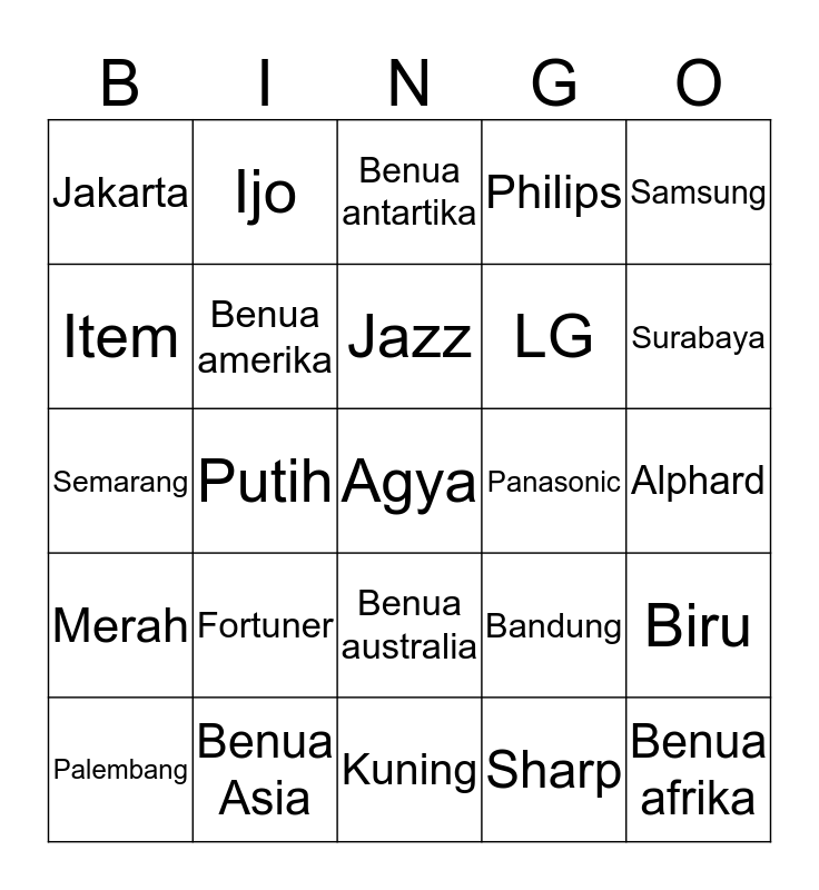 This bingo card has a free space and 24 words: Fortuner, Benua Asia, Jazz, Palembang, Samsung, Jakarta, Item, Ijo, Panasonic, Benua australia, LG, Semarang, Bandung, Biru, Benua amerika, Sharp, Alphard, Benua antartika, Surabaya, Putih, Benua afrika, Merah, Philips and Kuning.