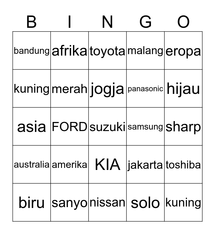 This bingo card has a free space and 24 words: amerika, sanyo, jogja, biru, eropa, bandung, kuning, afrika, samsung, KIA, panasonic, asia, jakarta, toshiba, merah, solo, sharp, toyota, hijau, FORD, kuning, australia, malang and nissan.