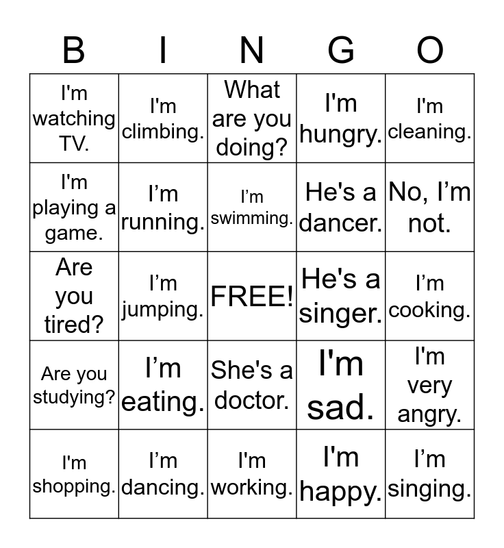 This bingo card has a free space and 24 words: I’m eating., I’m dancing., I’m swimming., I'm shopping., I'm cleaning., I'm watching TV., I'm playing a game., I'm climbing., He's a singer., She's a doctor., He's a dancer., Are you tired?, I'm sad., I'm very angry., I’m running., I'm happy., I’m cooking., What are you doing?, No, I’m not., I’m jumping., I’m singing., Are you studying?, I'm hungry. and I'm working..