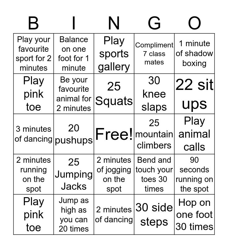 This bingo card has a free space and 24 words: 25 Jumping Jacks, Jump as high as you can 20 times, 25 Squats, Play pink toe, 1 minute of shadow boxing, Play your favourite sport for 2 minutes, Play pink toe, Balance on one foot for 1 minute, 25 mountain climbers, 2 minutes of jogging on the spot, 30 knee slaps, 3 minutes of dancing, Bend and touch your toes 30 times, 90 seconds running on the spot, Be your favourite animal for 2 minutes, 30 side steps, Play animal calls, Play sports gallery, 22 sit ups, 20 pushups, Hop on one foot 30 times, 2 minutes running on the spot, Compliment 7 class mates and 2 minutes of dancing.