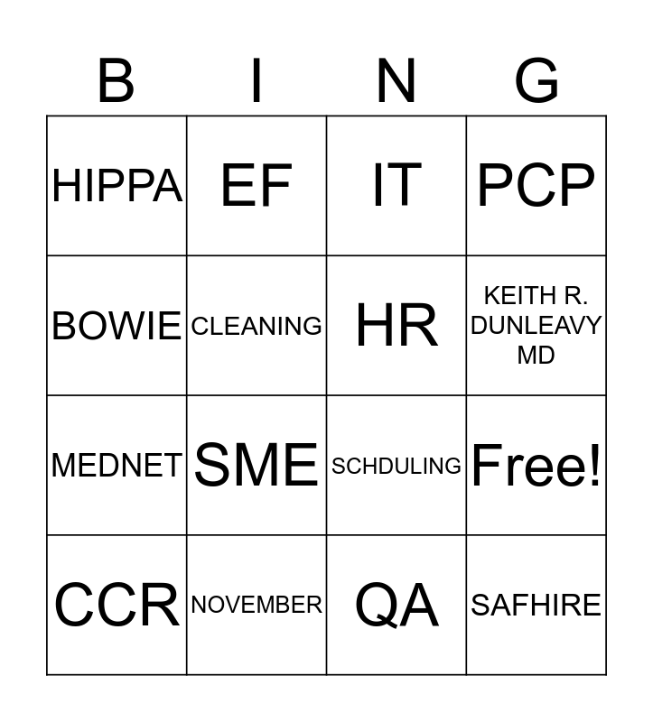 This bingo card has 20 words: Free!, MRR, IT, EPASS, CCR, BOWIE, NOVEMBER, HIPPA, MEDNET, EF, SME, SCHDULING, CLEANING, SAFHIRE, HR, CODING, KEITH R. DUNLEAVY MD, PCP, QA and PROVIDER ENGAGEMENT.