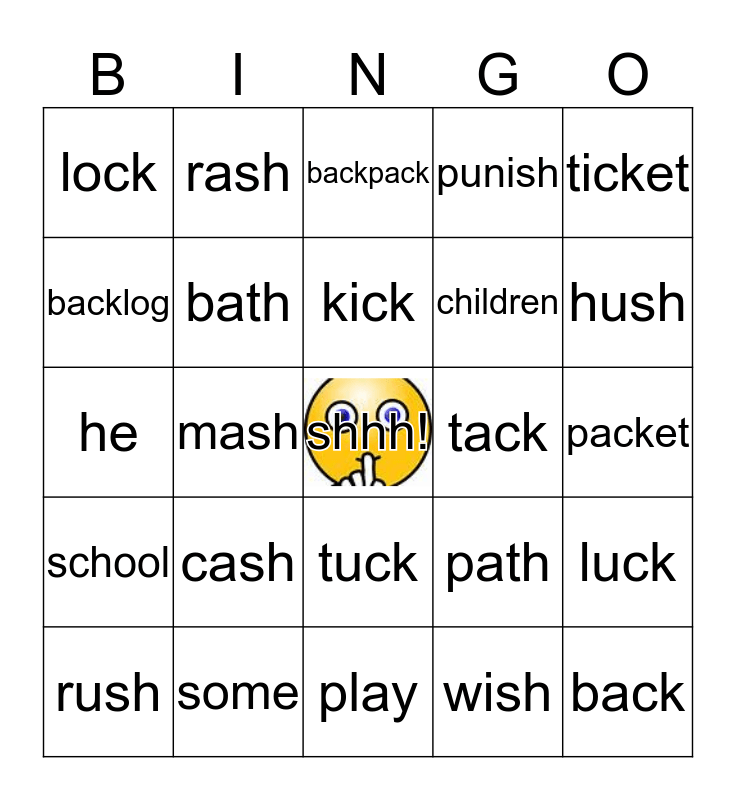 This bingo card has a free space and 24 words: cash, some, kick, rush, ticket, lock, backlog, rash, tack, tuck, children, he, path, luck, bath, wish, packet, backpack, hush, mash, back, school, punish and play.