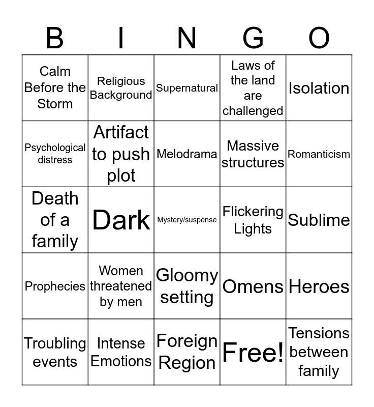 This bingo card has 25 words: Women threatened by men, Foreign Region, Melodrama, Troubling events, Isolation, Calm Before the Storm, Psychological distress, Religious Background, Flickering Lights, Gloomy setting, Massive structures, Death of a family, Omens, Heroes, Artifact to push plot, Tensions between family, Sublime, Supernatural, Romanticism, Dark, Mystery/suspense, Intense Emotions, Prophecies, Laws of the land are challenged and Free!.
