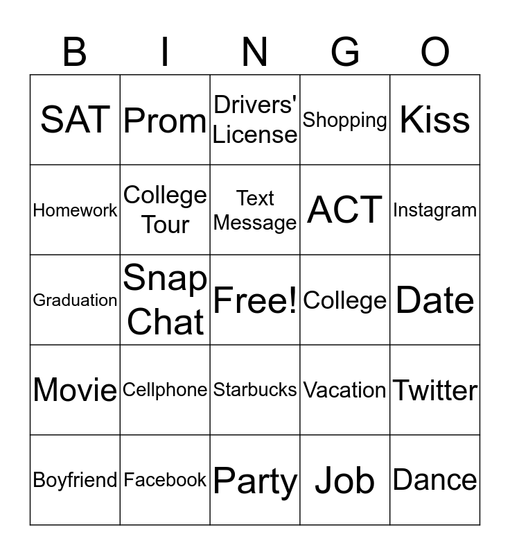 This bingo card has a free space and 24 words: Cellphone, Facebook, Text Message, Boyfriend, Kiss, SAT, Homework, Prom, College, Starbucks, ACT, Graduation, Vacation, Twitter, College Tour, Job, Date, Drivers' License, Instagram, Snap Chat, Dance, Movie, Shopping and Party.