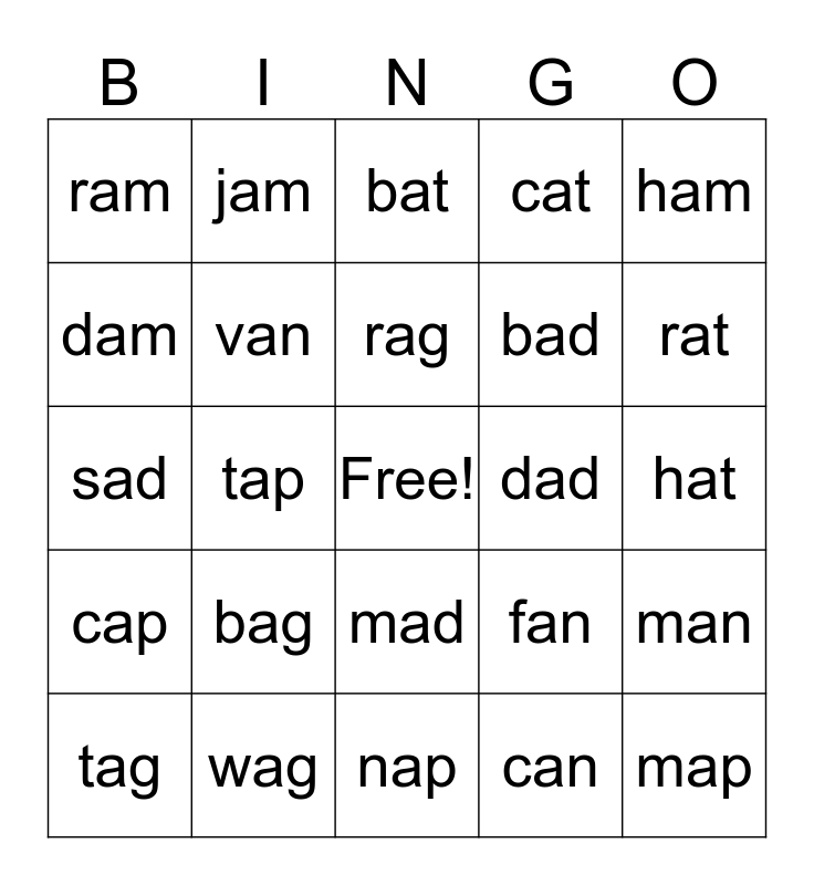 This bingo card has a free space and 24 words: bag, wag, rag, tag, ham, ram, dam, jam, dad, mad, bad, sad, fan, man, van, can, hat, bat, rat, tap, map, cap, cat and nap.
