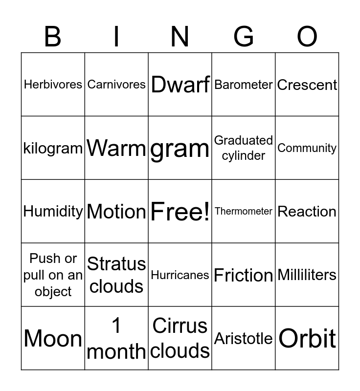 This bingo card has a free space and 44 words: Coal, Orbit, Gravity, Moon, 150 million km, Aristotle, Dwarf, Gibbous, Crescent, 1 month, Barometer, Thermometer, Hurricanes, Stratus clouds, Cumulus clouds, Cirrus clouds, Air pressure, Humidity, Population, Community, Carnivores, Decomposers, Front, Herbivores, Series, Reaction, Inertia, Heat, Friction, Push or pull on an object, Chemical energy, Milliliters, Soil, Speed, Motion, Stored, Kinetic, Constants, gram, kilogram, Graduated cylinder, Rain gauge, Warm and Cold.
