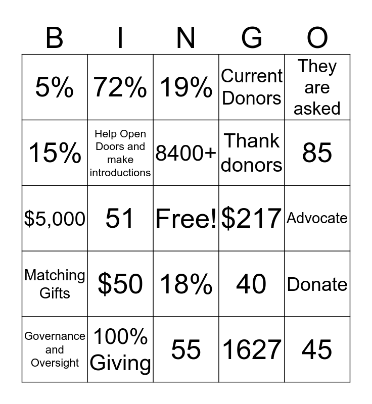 This bingo card has a free space and 26 words: 18%, 1627, 8400+, 100% Giving, They are asked, 5%, 15%, 72%, Advocate, 40, Thank donors, $5,000, Donate, Governance and Oversight, 51, 40, Current Donors, Matching Gifts, 19%, 45, 85, 55, $217, $50, Help Open Doors and make introductions and Salad, Filet Mignon, French Fries, Soda, BEER & WINE.