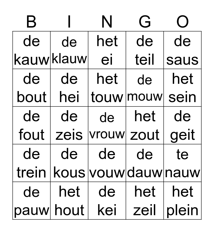 This bingo card has a free space and 24 words: de kous, het hout, het touw, de pauw, de saus, de kauw, de bout, de klauw, het zout, de vouw, de mouw, de fout, de dauw, te nauw, de hei, het zeil, de geit, het ei, het sein, de zeis, het plein, de trein, de teil and de kei.