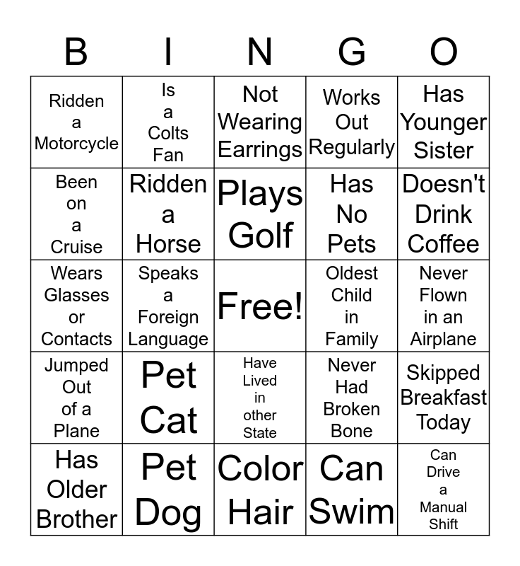 This bingo card has a free space and 24 words: Pet Cat, Pet Dog, Plays Golf, Has Older Brother, Has Younger Sister, Ridden a Motorcycle, Been on a Cruise, Is a Colts Fan, Oldest Child in Family, Have Lived in other State, Has No Pets, Wears Glasses or Contacts, Never Had Broken Bone, Skipped Breakfast Today, Ridden a Horse, Can Swim, Never Flown in an Airplane, Not Wearing Earrings, Doesn't Drink Coffee, Speaks a Foreign Language, Can Drive a Manual Shift, Jumped Out of a Plane, Works Out Regularly and Color Hair.
