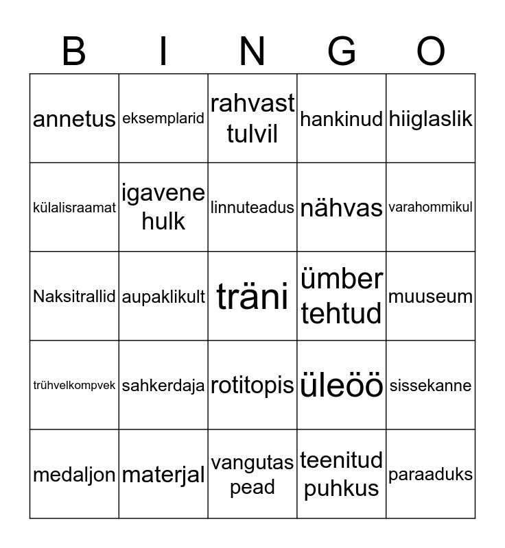 This bingo card has a free space and 27 words: üleöö, doktoritöö, nähvas, vangutas pead, külalisraamat, rahvast tulvil, eksemplarid, trühvelkompvek, ümber tehtud, sissekanne, Naksitrallid, hankinud, medaljon, materjal, varahommikul, marulise, igavene hulk, linnuteadus, sahkerdaja, annetus, muuseum, teenitud puhkus, aupaklikult, paraaduks, rotitopis, hiiglaslik and varandus.
