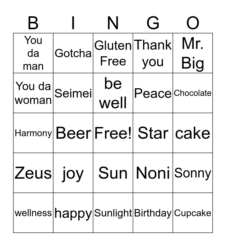 This bingo card has a free space and 24 words: joy, happy, be well, wellness, Mr. Big, You da man, You da woman, Gotcha, Star, Sun, Peace, Harmony, Noni, Sonny, Seimei, Birthday, cake, Gluten Free, Chocolate, Beer, Cupcake, Zeus, Thank you and Sunlight.