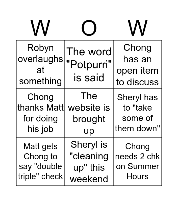 This bingo card has a free space and 8 words: Sheryl has to "take some of them down", Chong has an open item to discuss, The word "Potpurri" is said, Matt gets Chong to say "double triple" check, Robyn overlaughs at something, Chong needs 2 chk on Summer Hours, Chong thanks Matt for doing his job and Sheryl is "cleaning up" this weekend.