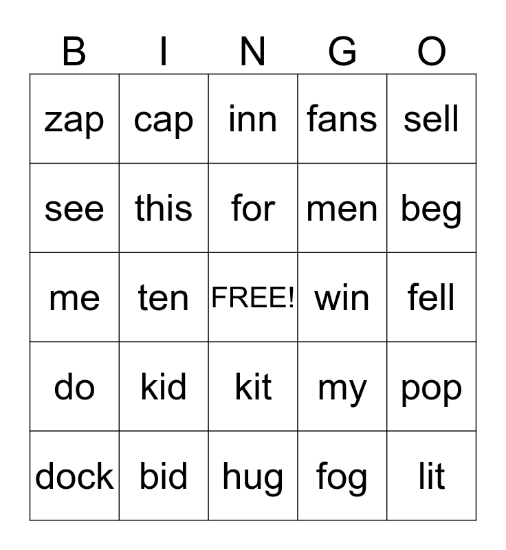 This bingo card has a free space and 45 words: he, lit, kids, dock, mug, fog, inn, lit, sell, bid, fans, win, kit, kid, sunset, hug, rap, me, lap, beg, cap, but, game, zap, hut, fell, den, net, my, do, jug, pop, top, putt, rut, ten, rub, gut, pet, for, see, men, we, this and for.