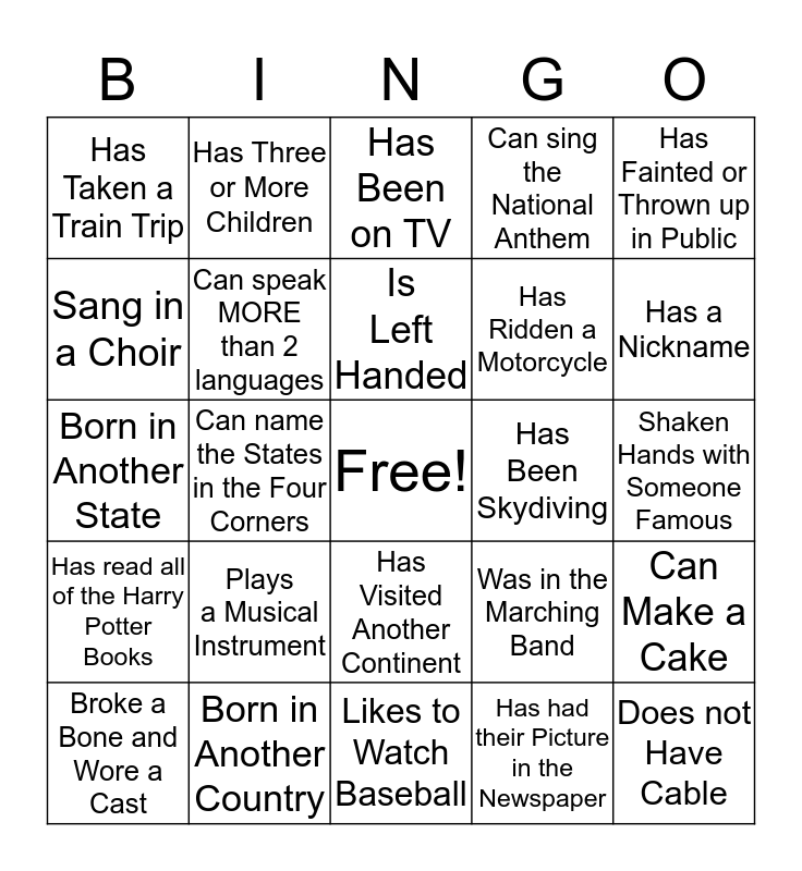 This bingo card has a free space and 24 words: Plays a Musical Instrument, Born in Another Country, Is Left Handed, Broke a Bone and Wore a Cast, Has Fainted or Thrown up in Public, Has Taken a Train Trip, Sang in a Choir, Has Three or More Children, Has Been Skydiving, Has Visited Another Continent, Has Ridden a Motorcycle, Born in Another State, Was in the Marching Band, Can Make a Cake, Can speak MORE than 2 languages, Has had their Picture in the Newspaper, Shaken Hands with Someone Famous, Has Been on TV, Has a Nickname, Can name the States in the Four Corners, Does not Have Cable, Has read all of the Harry Potter Books, Can sing the National Anthem and Likes to Watch Baseball.