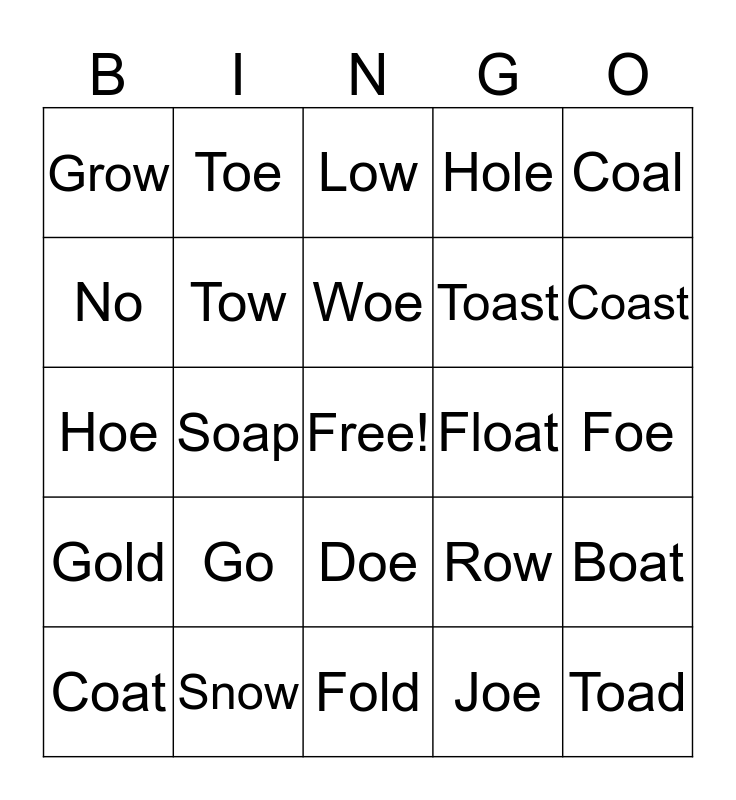 This bingo card has a free space and 24 words: Go, Snow, Woe, Coat, Coal, Grow, No, Toe, Float, Doe, Toast, Hoe, Row, Boat, Tow, Joe, Foe, Low, Coast, Soap, Toad, Gold, Hole and Fold.