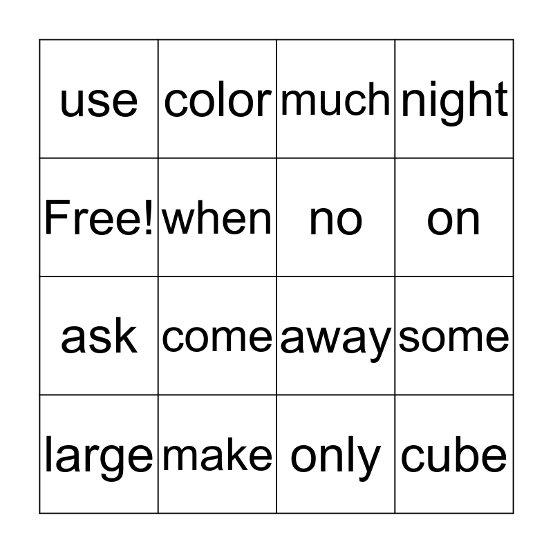 This bingo card has 16 words: make, some, much, use, ask, color, away, only, Free!, when, large, night, come, on, no and cube.