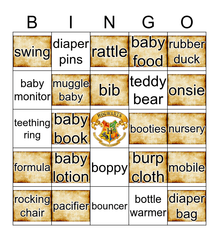 This bingo card has 24 images, a free space and 36 words: diapers, high chair, bottles, muggle baby, burp cloth, formula, bib, stroller, rubber duck, blanket, baby book, baby food, changing table, booties, onsie, swing, crib, baby lotion, diaper bag, rattle, nursery, mobile, pacifier, rocking chair, bouncer, diaper pins, teething ring, car seat, teddy bear, baby monitor, baby powder, swaddle, bottle warmer, boppy, lullaby and stork.