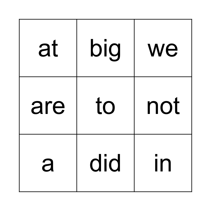 This bingo card has 9 words: a, we, big, are, at, not, to, in and did.