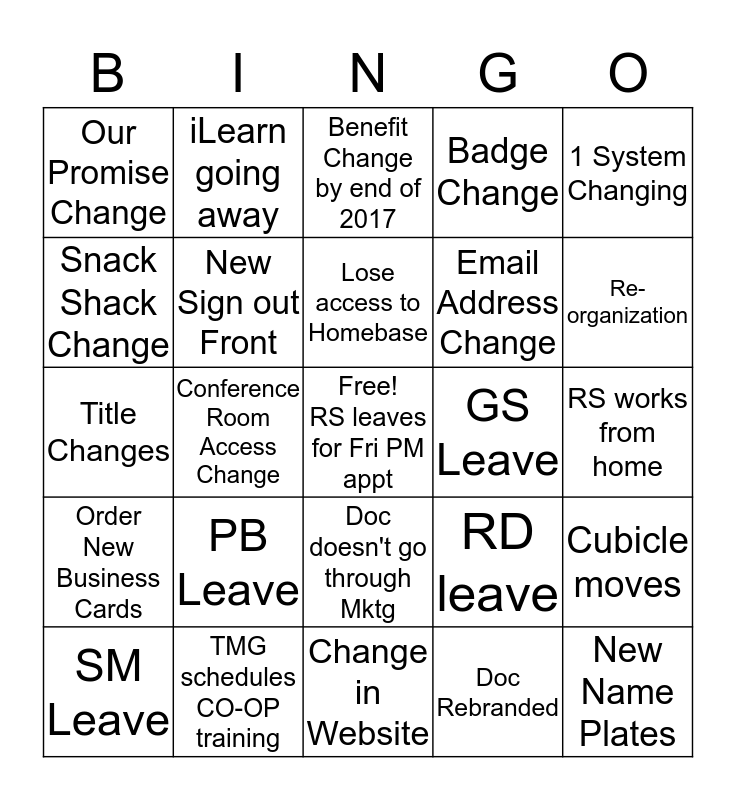This bingo card has a free space and 24 words: PB Leave, TMG schedules CO-OP training, Lose access to Homebase, SM Leave, 1 System Changing, Our Promise Change, Snack Shack Change, iLearn going away, GS Leave, Doc doesn't go through Mktg, Email Address Change, Title Changes, RD leave, Cubicle moves, New Sign out Front, Doc Rebranded, RS works from home, Benefit Change by end of 2017, Re-organization, Conference Room Access Change, New Name Plates, Order New Business Cards, Badge Change and Change in Website.