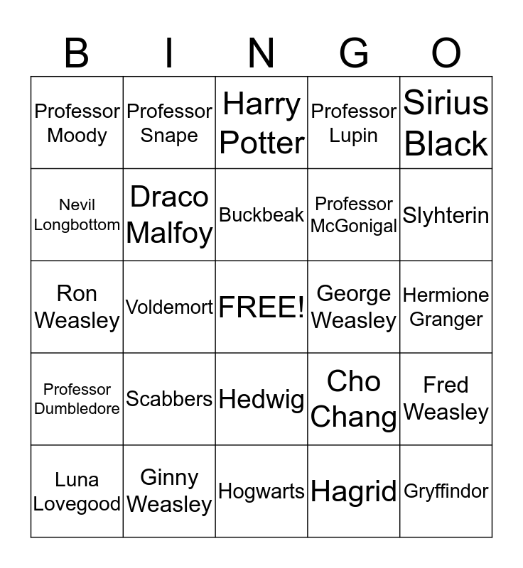 This bingo card has a free space and 24 words: Scabbers, Ginny Weasley, Buckbeak, Luna Lovegood, Sirius Black, Professor Moody, Nevil Longbottom, Professor Snape, George Weasley, Hedwig, Professor McGonigal, Ron Weasley, Cho Chang, Fred Weasley, Draco Malfoy, Hagrid, Hermione Granger, Harry Potter, Slyhterin, Voldemort, Gryffindor, Professor Dumbledore, Professor Lupin and Hogwarts.