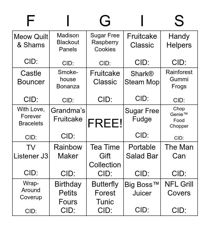 This bingo card has a free space and 24 words: Rainbow Maker CID:, Birthday Petits Fours CID:, Fruitcake Classic CID:, Wrap- Around Coverup CID:, Handy Helpers CID:, Meow Quilt & Shams CID:, Castle Bouncer CID:, Madison Blackout Panels CID:, Sugar Free Fudge CID:, Tea Time Gift Collection CID:, Shark® Steam Mop CID:, With Love, Forever Bracelets CID:, Portable Salad Bar CID:, The Man Can CID:, Smoke-house Bonanza CID:, Big Boss™ Juicer CID:, Chop Genie™ Food Chopper CID:, Sugar Free Raspberry Cookies CID:, Rainforest Gummi Frogs CID:, Grandma’s Fruitcake CID:, NFL Grill Covers CID:, TV Listener J3 CID:, Fruitcake Classic CID: and Butterfly Forest Tunic CID:.
