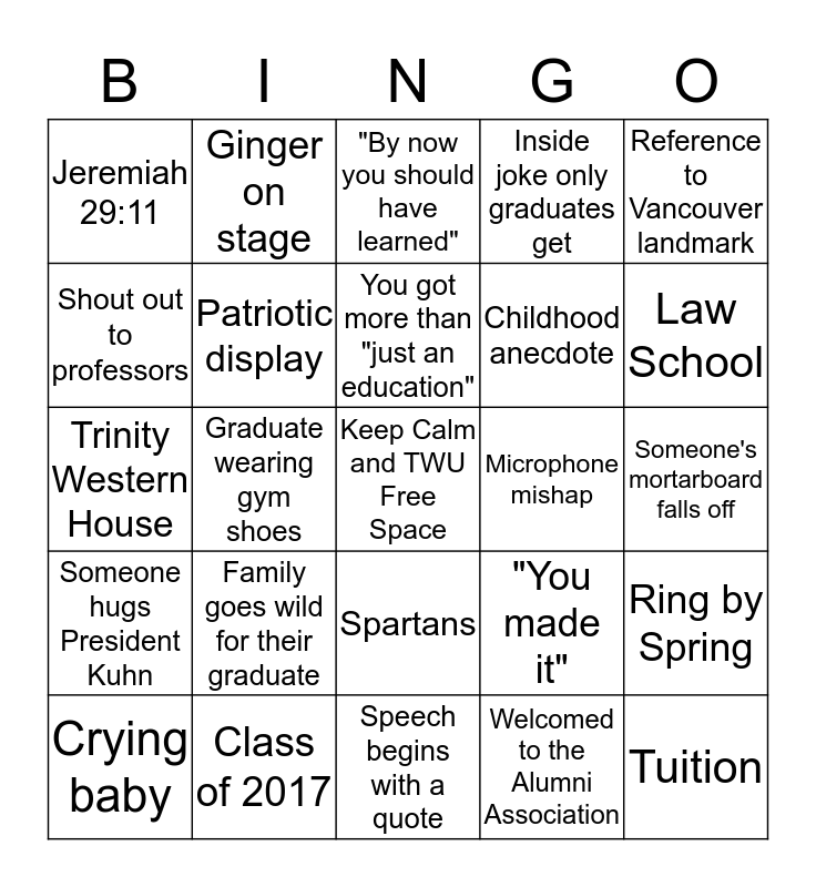 This bingo card has a free space and 24 words: Family goes wild for their graduate, Class of 2017, You got more than "just an education", Crying baby, Reference to Vancouver landmark, Jeremiah 29:11, Shout out to professors, Ginger on stage, Microphone mishap, Spartans, Childhood anecdote, Trinity Western House, "You made it", Ring by Spring, Patriotic display, Welcomed to the Alumni Association, Someone's mortarboard falls off, "By now you should have learned", Law School, Graduate wearing gym shoes, Tuition, Someone hugs President Kuhn, Inside joke only graduates get and Speech begins with a quote.
