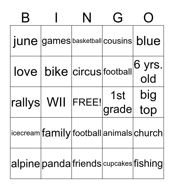 This bingo card has a free space and 24 words: family, panda, circus, alpine, blue, june, love, games, 1st grade, football, football, rallys, animals, church, bike, cupcakes, big top, basketball, 6 yrs. old, WII, fishing, icecream, cousins and friends.