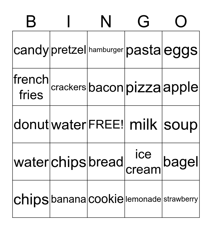 This bingo card has a free space and 27 words: ice cream, hot dog, pizza, cookie, french fries, hamburger, pretzel, water, milk, bagel, donut, pasta, chips, banana, apple, cereal, crackers, bacon, chips, candy, soup, lemonade, water, strawberry, bread, eggs and orange juice.