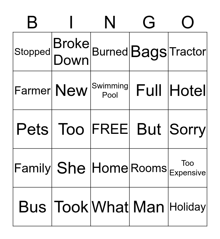This bingo card has a free space and 24 words: She, Took, Swimming Pool, Bus, Tractor, Stopped, Farmer, Broke Down, But, Home, Full, Pets, Rooms, Too Expensive, New, Man, Sorry, Burned, Hotel, Too, Holiday, Family, Bags and What.