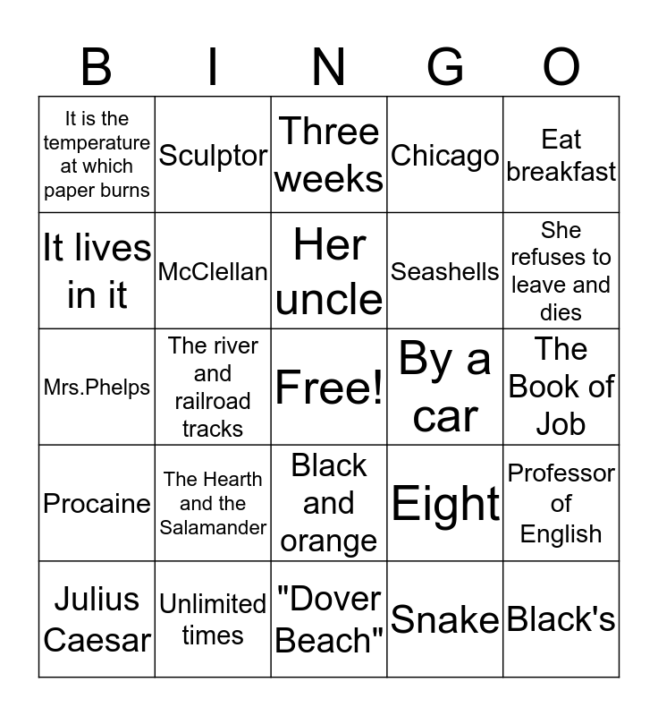 This bingo card has a free space and 24 words: The Hearth and the Salamander, Unlimited times, Her uncle, Julius Caesar, Eat breakfast, It is the temperature at which paper burns, It lives in it, Sculptor, By a car, Black and orange, Seashells, Mrs.Phelps, Eight, Professor of English, McClellan, Snake, The Book of Job, Three weeks, She refuses to leave and dies, The river and railroad tracks, Black's, Procaine, Chicago and "Dover Beach".