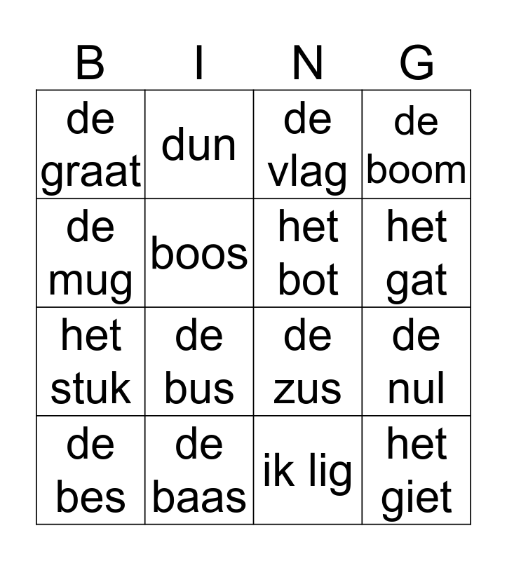 This bingo card has 31 words: Free!, leeg, de nul, het bos, de graat, de vlag, het bot, de vraag, de baas, ik vul, ik lig, de bes, de kraag, de kus, de bus, laag, de gum, de bon, het giet, de brug, de mug, de bril, de maag, dun, het stuk, boos, de boom, de zus, de bom, het gat and de biet.