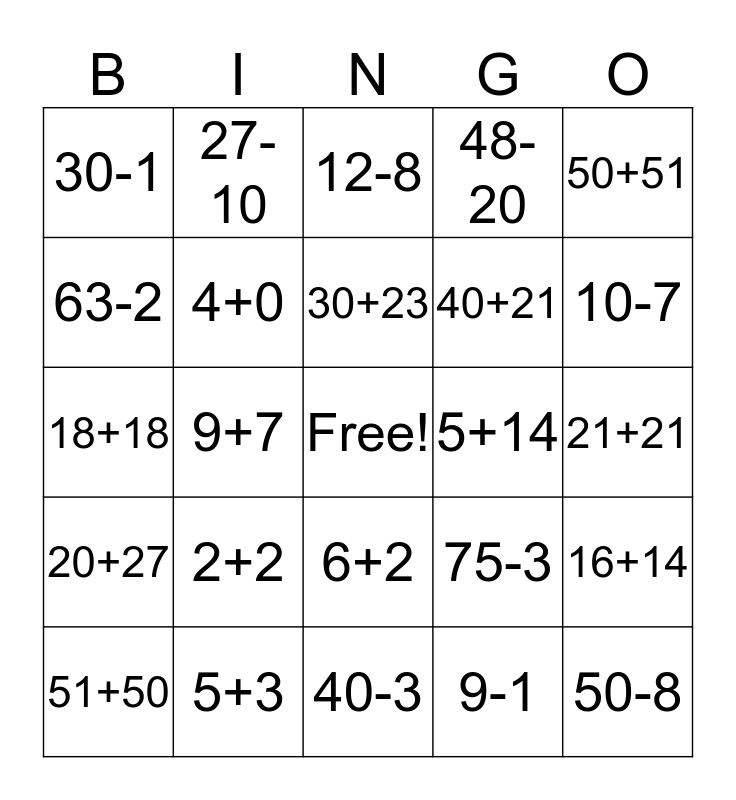 This bingo card has a free space and 30 words: 5+3, 30-15, 9+7, 26-10, 30-1, 12-8, 4+0, 6+2, 5+14, 40-3, 21+21, 50-8, 9-1, 8+3, 10-7, 40+32, 75-3, 20+27, 2+2, 50+51, 18+18, 13+14, 27-10, 40+21, 63-2, 48-20, 16+14, 51+50, 30+23 and 27-3.