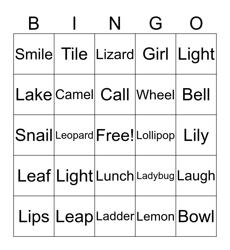This bingo card has a free space and 24 words: Light, Leap, Call, Lips, Light, Smile, Lake, Tile, Lollipop, Lunch, Wheel, Snail, Ladybug, Laugh, Camel, Lemon, Lily, Lizard, Bell, Leopard, Bowl, Leaf, Girl and Ladder.