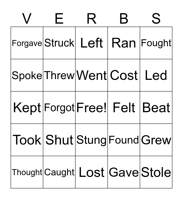 This bingo card has a free space and 100 words: Was / were, Bore, Beat, Became, Began, bent, Bit, Blew, Broke, Brought, Built, Burnt, Bought, Caught, Chose, Came, Cost, Cut, Dug, Did, Drew, Drank, Drove, Ate, Fell, Felt, Fought, Found, Flew, Forbade, Forgot, Forgave, Froze, Got, Gave, Went, Grew, Had, Heard, Hit, Held, Hurt, Kept, Knew, Led, Left, Lent, Let, Lay, Lost, Made, Meant, Met, Paid, Put, Read, rode, Rang, Rose, Ran, Said, Saw, Sold, Sent, Set, Sewed, shook, Shone, Shot, Showed, Shrank, Shut, Sang, Sank, Sat, Slept, Slid, Spoke, Sped, Spent, Stood, Stole, Stuck, Stung, Stank, Struck, Swore, Swept, Swam, Took, Taught, Tore, Told, Thought, Threw, Understood, Woke, Wore, Won and wrote.