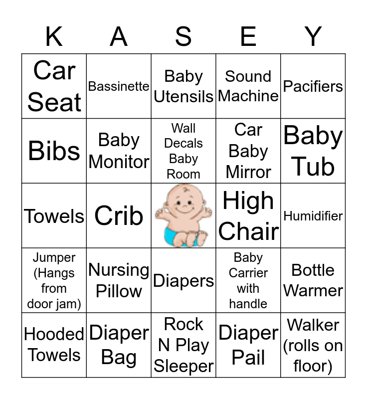 This bingo card has a free space and 24 words: Nursing Pillow, Diaper Bag, Wall Decals Baby Room, Hooded Towels, Pacifiers, Car Seat, Bibs, Bassinette, High Chair, Diapers, Car Baby Mirror, Towels, Baby Carrier with handle, Bottle Warmer, Baby Monitor, Diaper Pail, Humidifier, Baby Utensils, Baby Tub, Crib, Walker (rolls on floor), Jumper (Hangs from door jam), Sound Machine and Rock N Play Sleeper.