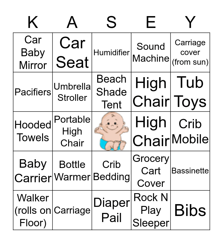 This bingo card has a free space and 24 words: Bottle Warmer, Carriage, Beach Shade Tent, Walker (rolls on Floor), Carriage cover (from sun), Car Baby Mirror, Pacifiers, Car Seat, High Chair, Crib Bedding, High Chair, Hooded Towels, Grocery Cart Cover, Bassinette, Umbrella Stroller, Rock N Play Sleeper, Crib Mobile, Humidifier, Tub Toys, Portable High Chair, Bibs, Baby Carrier, Sound Machine and Diaper Pail.