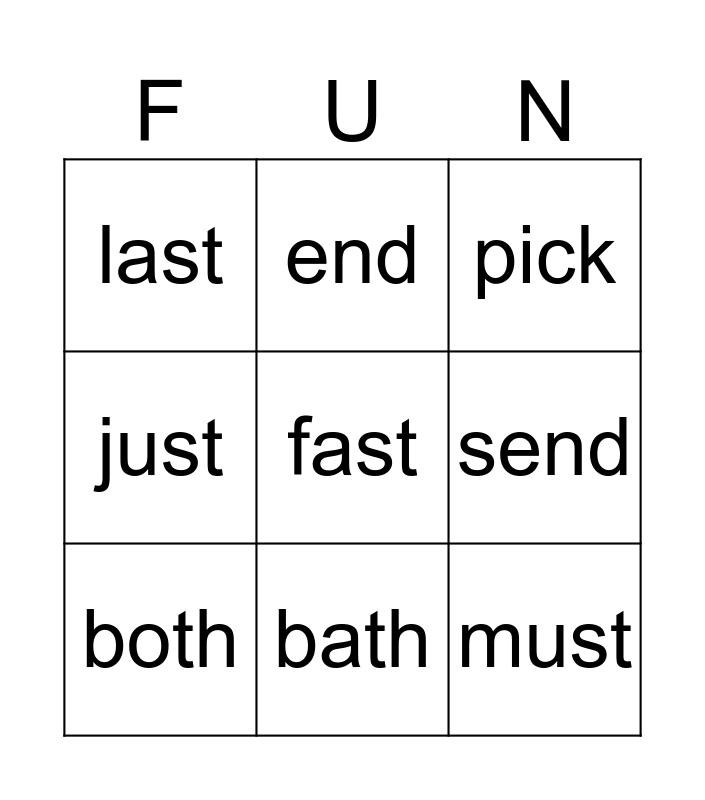 This bingo card has a free space and 8 words: send, pick, end, both, last, must, just and bath.