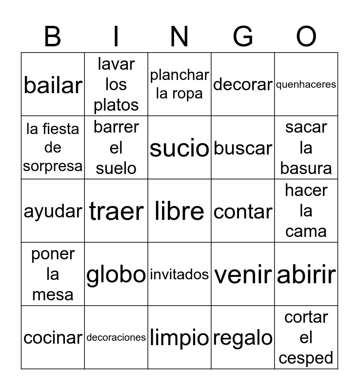 This bingo card has a free space and 24 words: globo, decoraciones, sucio, cocinar, quenhaceres, bailar, la fiesta de sorpresa, lavar los platos, contar, invitados, buscar, ayudar, venir, abirir, barrer el suelo, regalo, hacer la cama, planchar la ropa, sacar la basura, traer, cortar el cesped, poner la mesa, decorar and limpio.